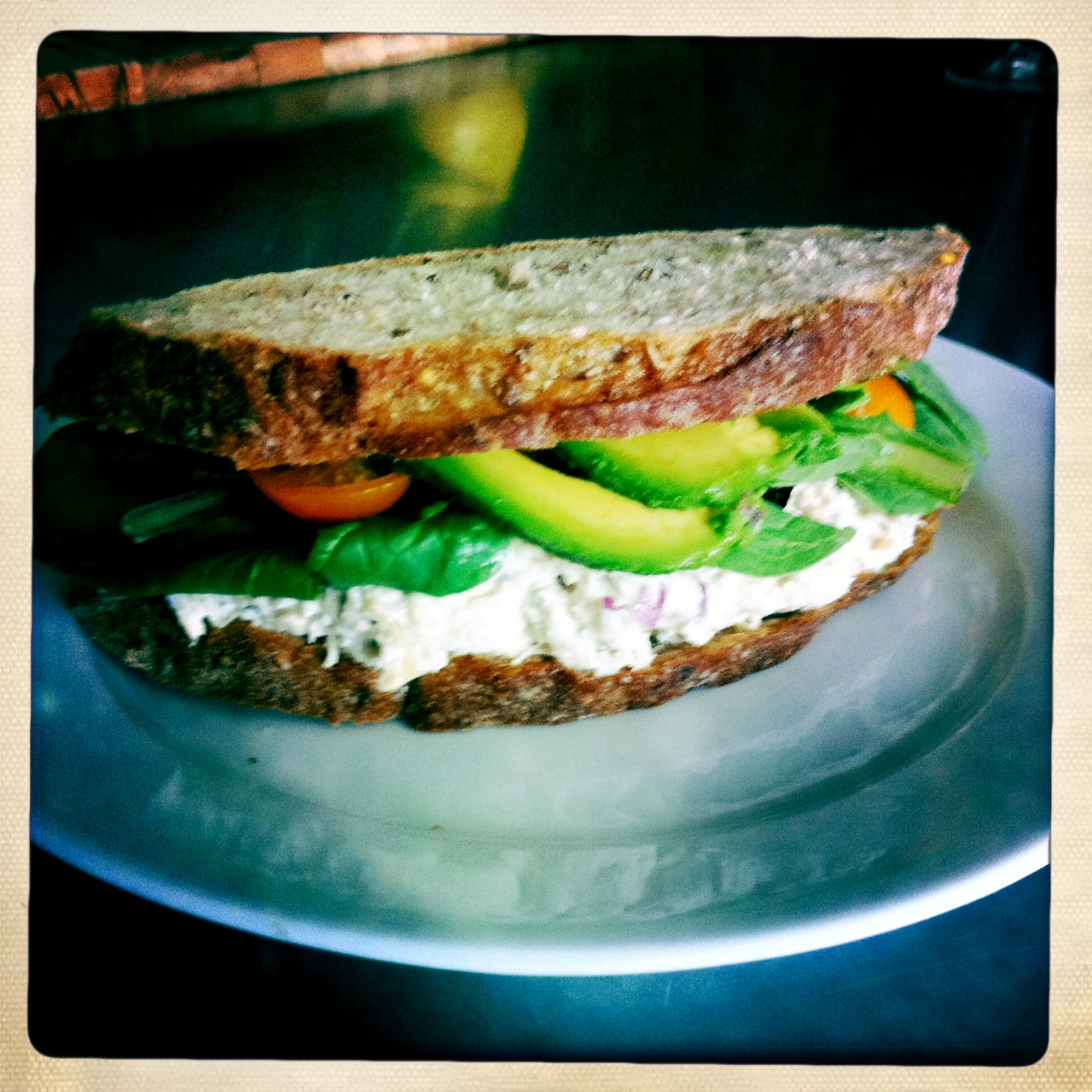 this sandwich can be easily screwed up, but also, if made well, one of the most satisfying of sandwiches. i stopped eating catering around season two of the tv show i worked on for seven years, and would mostly eat sandwiches off the craft services truck for lunch. thankfully they would have canned tuna and all the fixins to make my own. somedays i would just mix in some mayonnaise, pepper, and fresh lemon juice. other days it would be red onion, peperonchini, spicy mustard, sweet relish, mayonnaise, and pepper. at home (as shown above) i like to put in marinated artichokes, garlic, red onion, and herbs with greens, avocado and sweet cherry tomatoes on top.