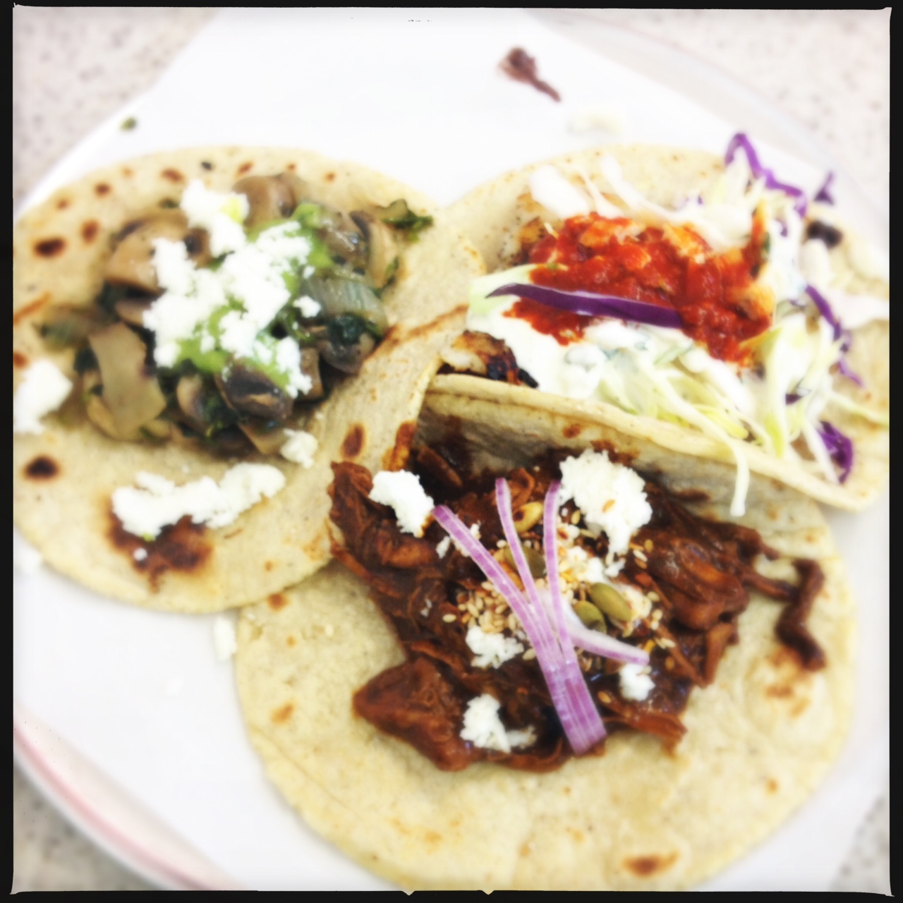 the menu is fairly prolific, so i just chose a selection of three different tacos: hongos, pescado, and mole pollo. the tortillas were thicker than what i am used to, so i was full halfway through my second taco, but i trudged on, not unhappily by any means.