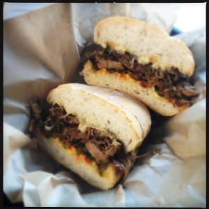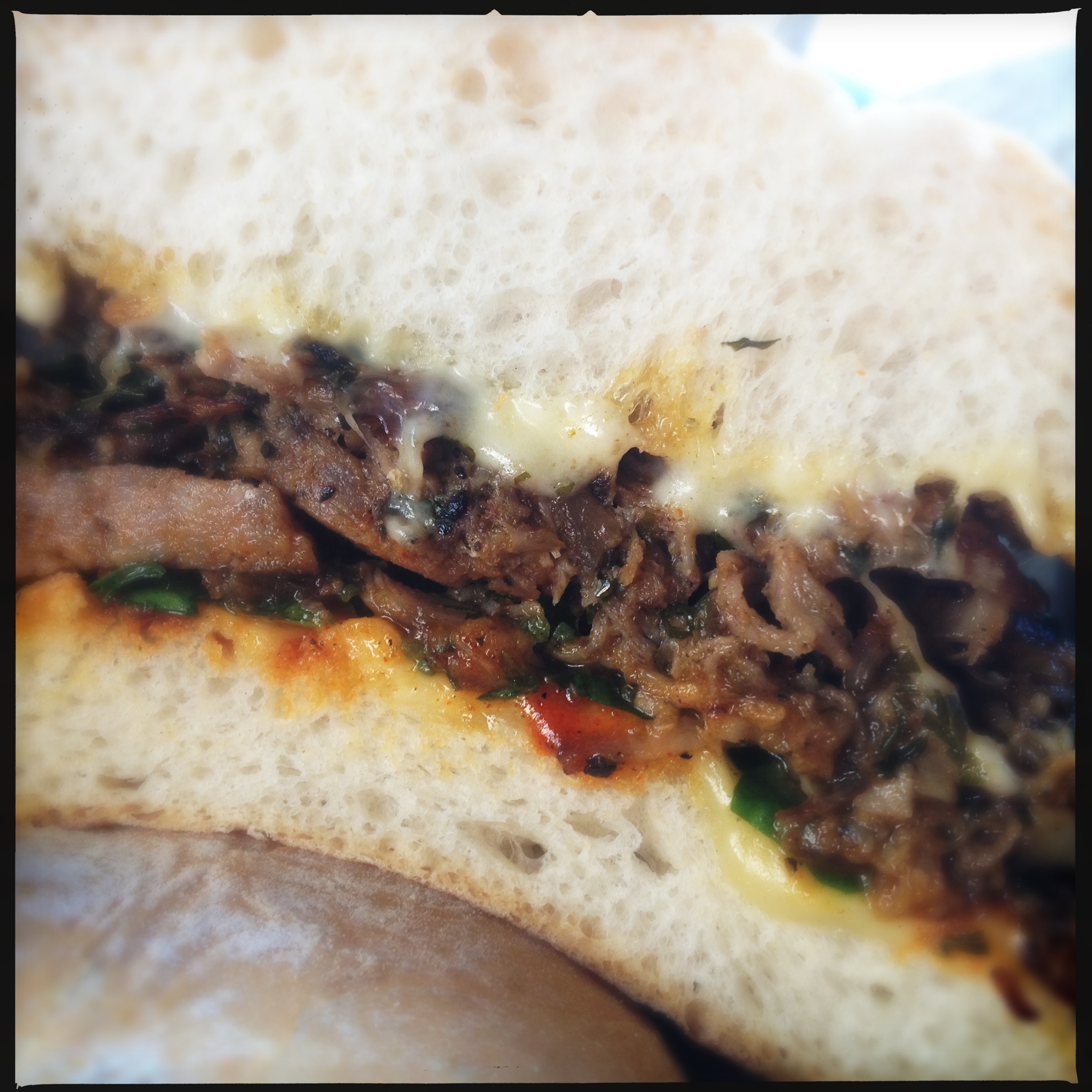 lunch at belly shack, chicago, il: pork rib + sausage sandwich with chihuahua cheese, caramelized onions, and mushrooms.