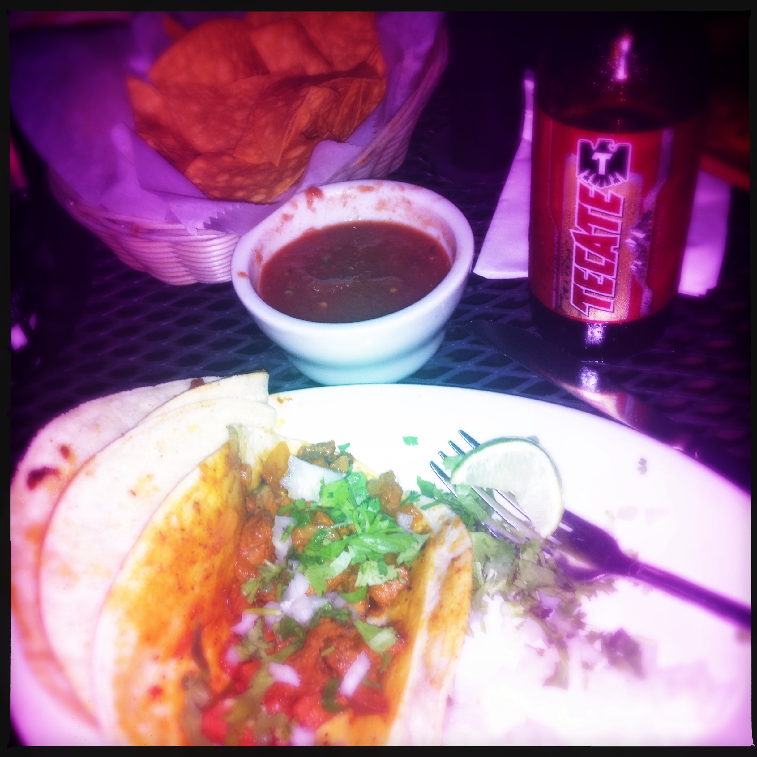 dinner at casa tequila, tiffin, ia: pork tacos, tecate.