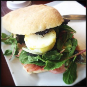 breakfast at mars cafe, des moines, ia: ham + egg, lavender dijon on ciabatta, intelligentsia americano.