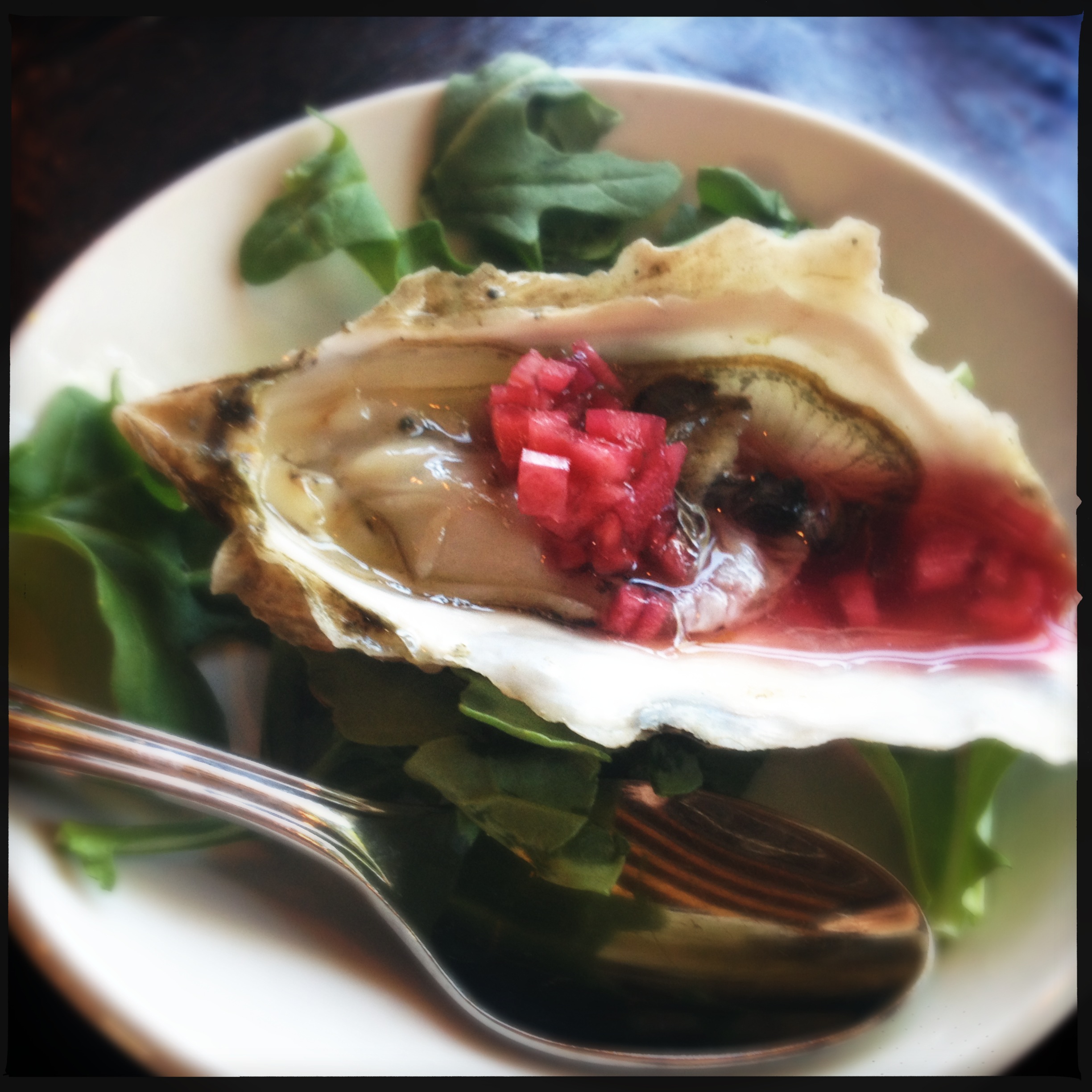 lunch at the pullman food + drink, glenwood springs, co: miyagi oyster with cranberry fennel vinaigrette, pulled pork in balsamic bbq, homemade talera bread, tempura caramelized onions and asparagus, salad with house vinaigrette.