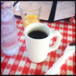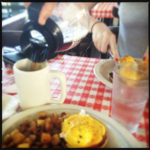 breakfast at jailhouse cafe, moab, ut: coffee, eggs benedict, bacon, more coffee.