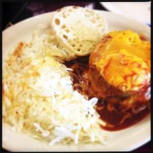breakfast at cameron trading post, cameron, az: red ranchero cheese eggs benedict, hashbrowns.