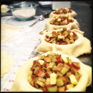 rhubarb brings me back to my grandma’s homemade crisps. i tried my hand at a strawberry rhubarb pie once, but it turned out a bit soupy (i blame the juicy strawberries from harry’s berries.) i decided to skip the berries this time, and make 4 mini pies, using 5-inch tin pans that i got at surfas. i just happened to have some fresh thyme on hand and thought it might be an interesting compliment with the tart rhubarb. since i have always wanted to try using lard in my crust, and i had picked some up at lindy + grundy when i was there last, i substituted it for the shortening in the dough recipe.