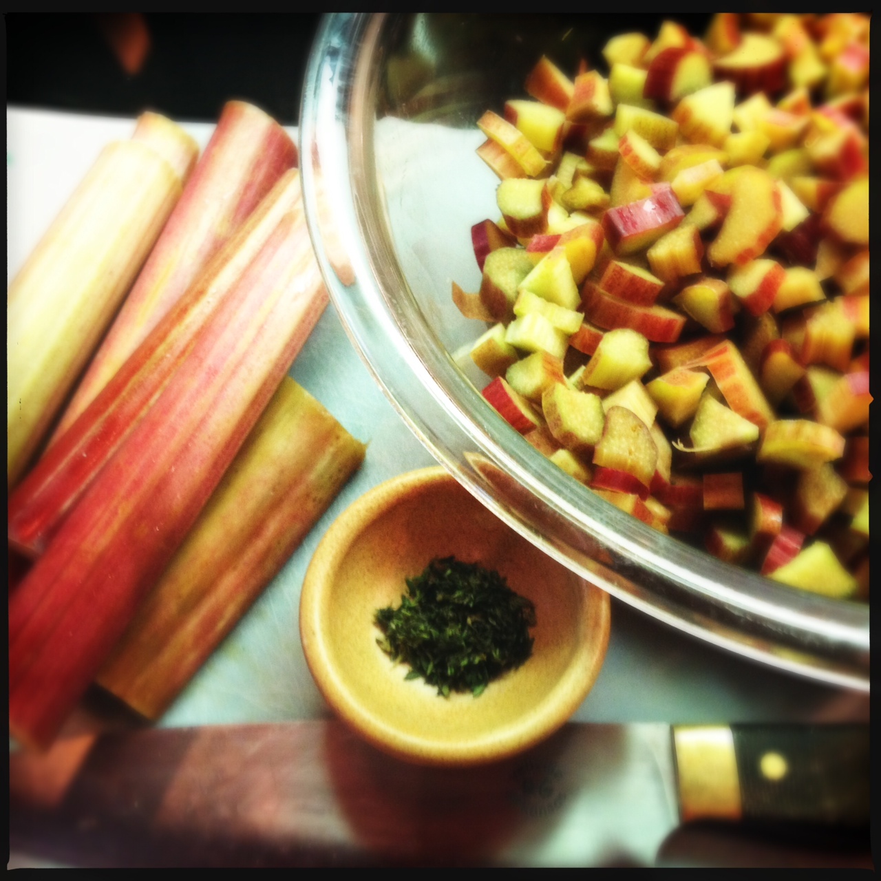 this is stupid easy. toss the thyme with the chopped rhubarb.